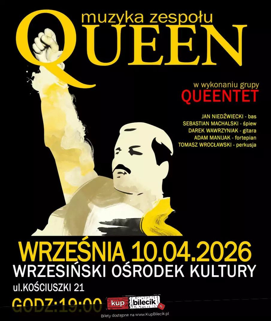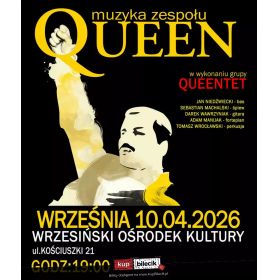 bilety: Muzyka zespołu Queen w wykonaniu grupy QUEENTET - WRZEŚNIA, Wrzesiński Ośrodek Kultury - 10 kwietnia 2026! Zapraszamy w piątek 10 kwietnia 2026 do Ośrodka Kultury we Wrześni przy ul. Kościuszki 21. Początek koncertu o 19:00 Sebastian Machalski (wokal) w tym zestawieniu muzycy wystąpili pod koniec 2018 roku na premierze filmu "Bohemian Rhapsody" a teraz ruszają w Polskę z koncertami, by również w średnich i mniejszych miastach przypomnieć fanom wspaniały dorobek grupy Queen. Bilety do nabycia na: KupBilecik.plQueentet artyści: Sebastian Machalski, Jan Niedźwiecki, Darek Wawrzyniak, Adam Manijak, Tomasz WrocławskiSkład 5-osobowej grupy Queentet tworzą muzycy, który od 10 lat lat wykonują piosenki Queen z towarzyszeniem orkiestry symfonicznej. To gwarancja rozrywki na najwyższym poziomie przy kompozycjach, które na stałe weszły do kanonu rocka. Twórcy i muzycy projektu Queen Symfonicznie, którzy od lat przemierzają kraj i zagranicę z repertuarem Freddiego, Briana, Johna i Rogera, postanowili zaprezentować fanom nowe wcielenie - 5-osobową grupę QUEENTET, która zaprezentuje na żywo klasyczne już utwory takie jak "Bohemian Rhapsody", "We Will Rock You", "We Are The Champions" "I Want It All", "Anoher One Bites The Dust", "Radio Gaga", "Somebody To Love", "Keep Yourself Alive" w dynamicznych rockowych wersjach. Bilety do nabycia na: KupBilecik.pl |
