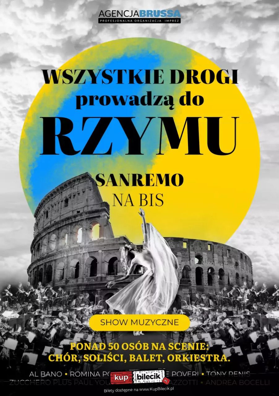 bilety: Wiadomo, że najpiękniejsza jest muzyka włoska - nie tylko opery Gioacchina Rossiniego, Giuseppe Verdiego czy Giacoma Pucciniego, ale też utwory z repertuaru Adriana Celentano, Al Bano, Andrei Bocellego, Drupiego (a to zaledwie początek alfabetu!). Muzyka włoska to także Festiwal w San Remo, którego złoty okres przypadł na lata 60. i 70., zaś niejedna gwiazda rozbłysła na tamtejszym niebie, rozpoczynając swoją karierę na brzegu Morza Śródziemnego: Toto Cutugno, zespół Il Volo... No ale czyż można się dziwić, że takie melodie powstają pod słońcem Toskanii, na falach laguny weneckiej, w cieniu Colosseum, pośród zaułków Neapolu? I my też chcemy zaprosić Państwa na ten magiczny wieczór z muzyką powstającą od Turynu do Sycylii, skąpany w śpiewności języka włoskiego, z udziałem zagranicznych wokalistów - odtworzymy tam razem atmosferę najsłynniejszych koncertów w San Remo. Pomogą w tym przeboje takie jak "Quando, quando", "Felicità", "Miserere", "Parole, parole", z których większość opowiada o miłości, bo wiadomo - jak piosenka włoska, to "Grande amore" (ten utwór też zabrzmi podczas naszego koncertu). A zatem - startujemy do Italii! Wszystkie drogi prowadzą do Rzymu - Sanremo na Bis artyści: Nazariy Yakobenchuk, Badri Adamia, Vladyslav Yatsentiuk, Roman Chawa, Firahina Hanna, Maria KononovaWiadomo, że najpiękniejsza jest muzyka włoska – nie tylko opery Gioacchina Rossiniego, Giuseppe Verdiego czy Giacoma Pucciniego, ale też utwory z repertuaru Adriana Celentano, Al Bano, Andrei Bocellego, Drupiego (a to zaledwie początek alfabetu!). Chcemy zaprosić Państwa na ten magiczny wieczór z muzyką powstającą od Turynu do Sycylii, skąpany w śpiewności języka włoskiego, z udziałem zagranicznych wokalistów – odtworzymy tam razem atmosferę najsłynniejszych koncertów w San Remo. Pomogą w tym przeboje takie jak „Quando, quando", „Felicità", „Miserere", „Parole, parole", z których większość opowiada o miłości, bo wiadomo – jak piosenka włoska, to „Grande amore" (ten utwór też zabrzmi podczas naszego koncertu). A zatem – startujemy do Italii! Bilety do nabycia na: KupBilecik.pl |